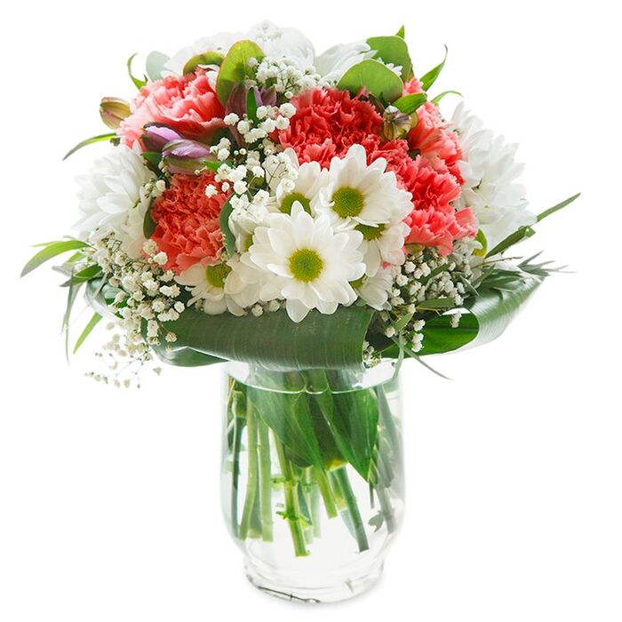Embrace the enchanting allure of our Celestial Bloom Medley, a floral arrangement that combines sublime beauty with exceptional freshness. This carefully curated bouquet features a harmonious mix of crisp white chrysanthemums, ethereal gypsophila, and light pink carnations, all gracefully arranged with vibrant aspidistra leaves. Each bloom is hand-selected to ensure only the finest quality and long-lasting freshness, offering a gift that is as unique as it is delightful.
